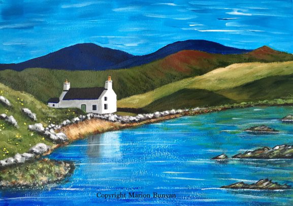 Around the Hebrides you find many so called 'White Houses' which where build after people left their 'Blackhouses' for more improved living conditions. This one is next to a sea loch with the tide going out. I used my 'artistic licence' here as this exact place doesn't exist but it is based on the area around Uig on the Isle of Lewis. A beautiful place and my favorite.