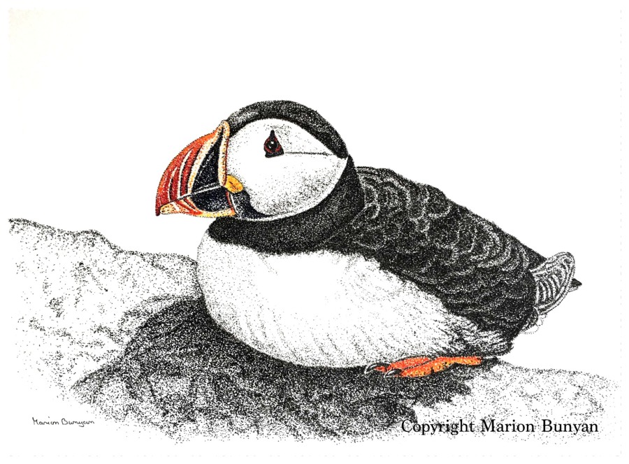 I love puffins. I spotted this little cutie a few years ago on a visit to Bempton Cliffs RSPB Reserve in South Yorkshire. Dotty is entirely made up out of thousands of tiny little dots which is called 'stippling' or what I would call a 'Labour of Love'. I love the way the image slowly appears on my paper by just adding dot after dot. As you can imagine it takes a while to do!